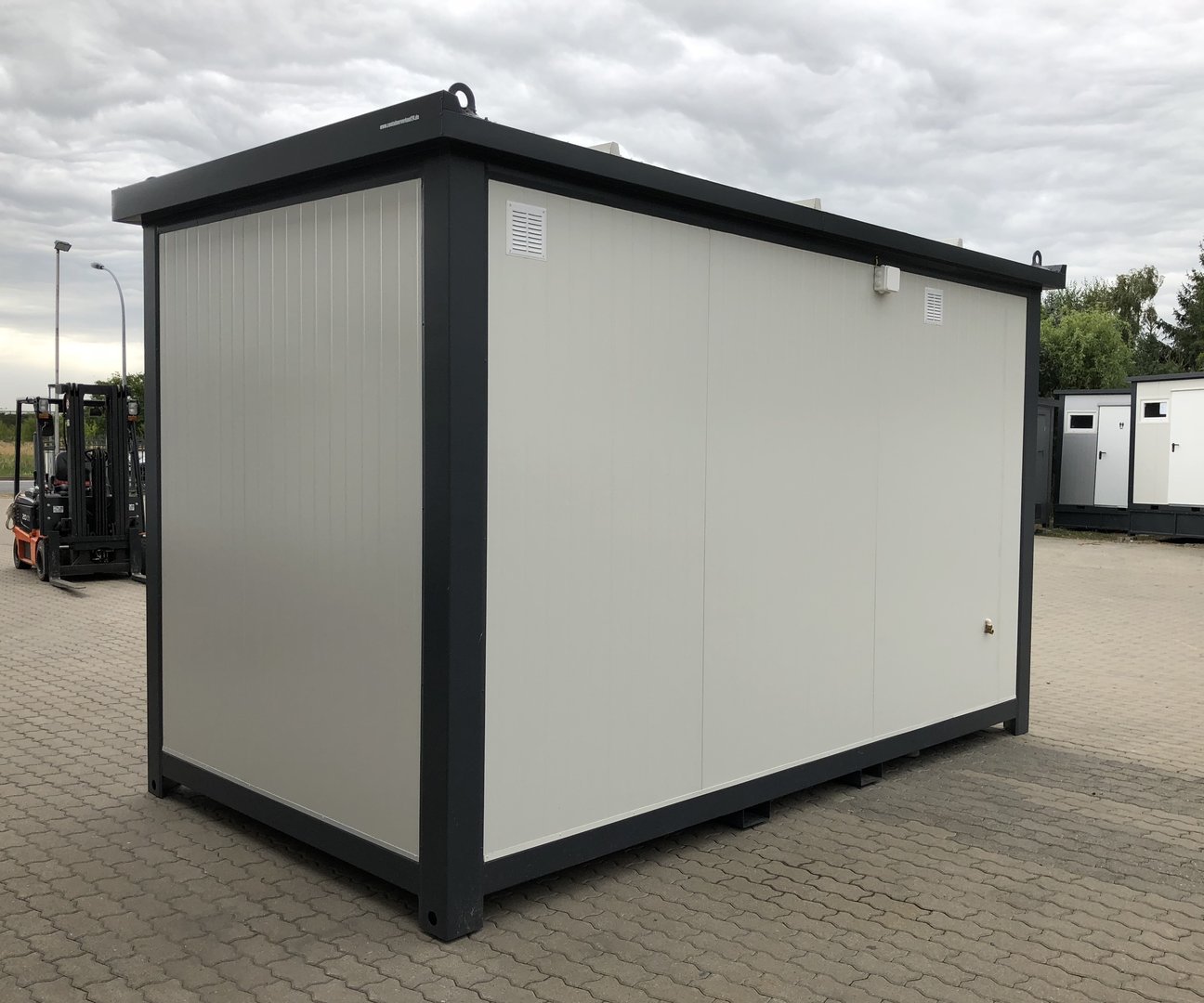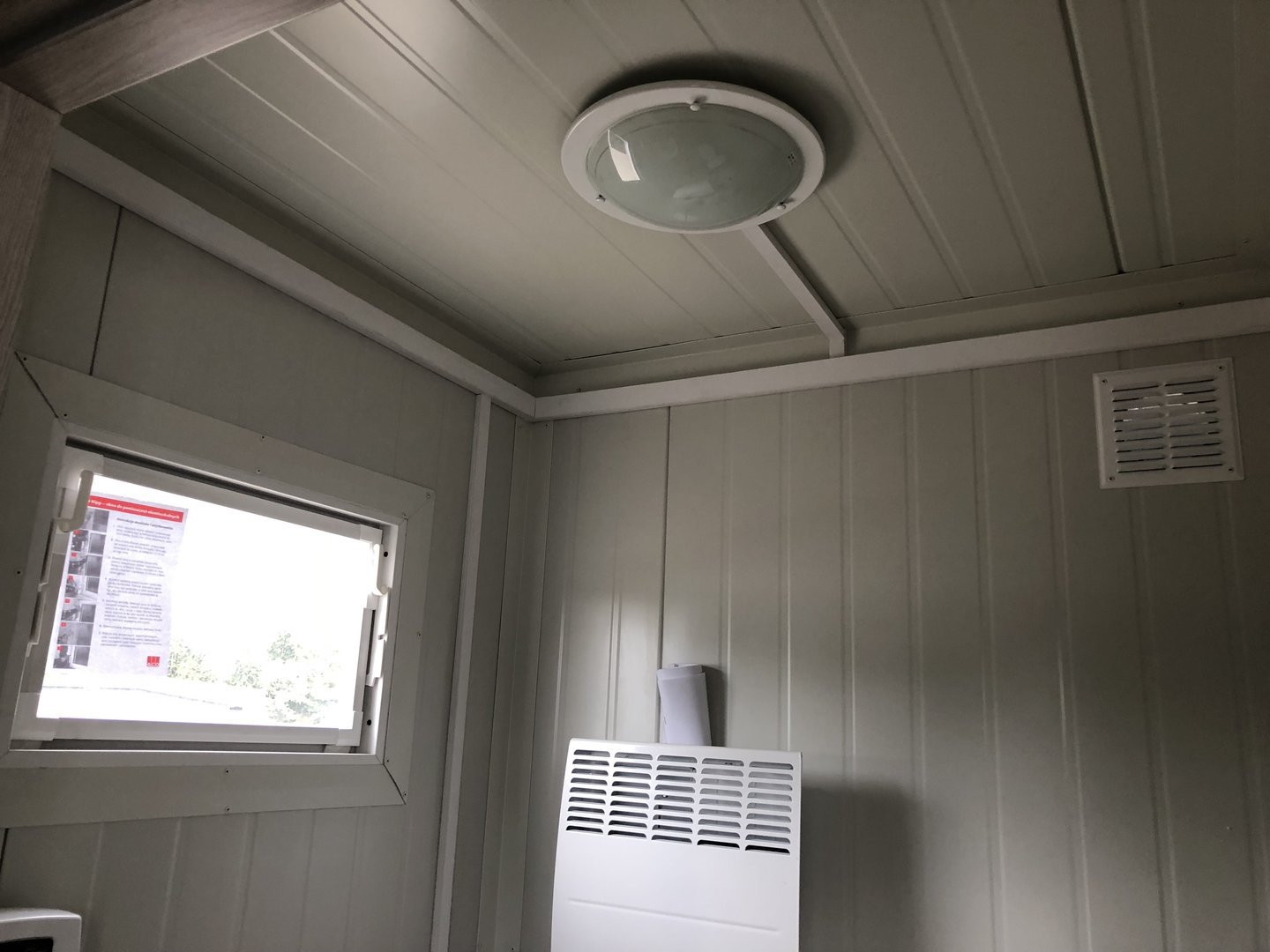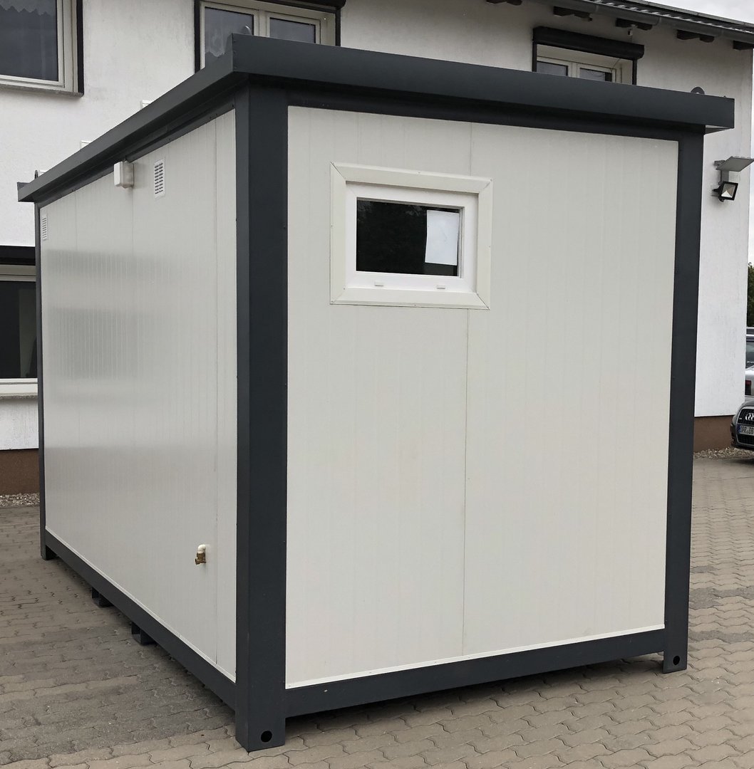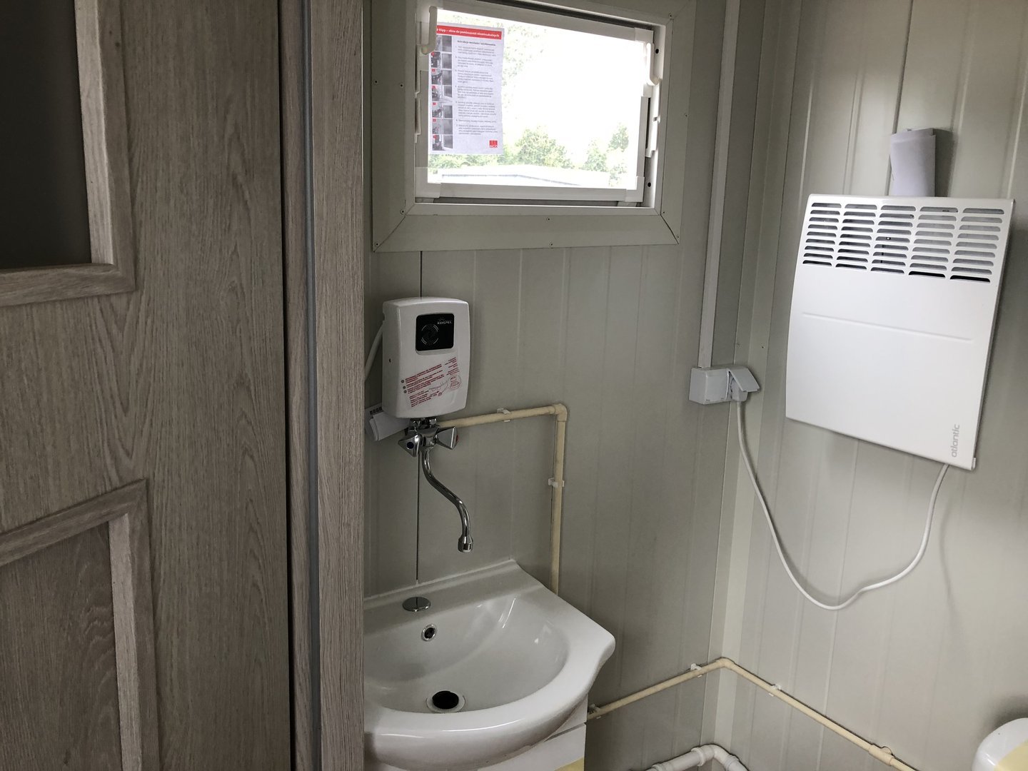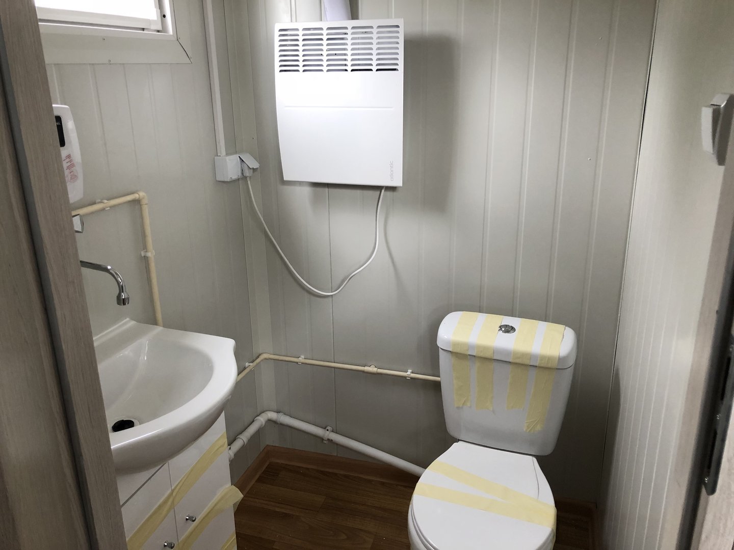 Conteneur aménagé en bureau de 4 x 2,20 mètres avec installations sanitaires.